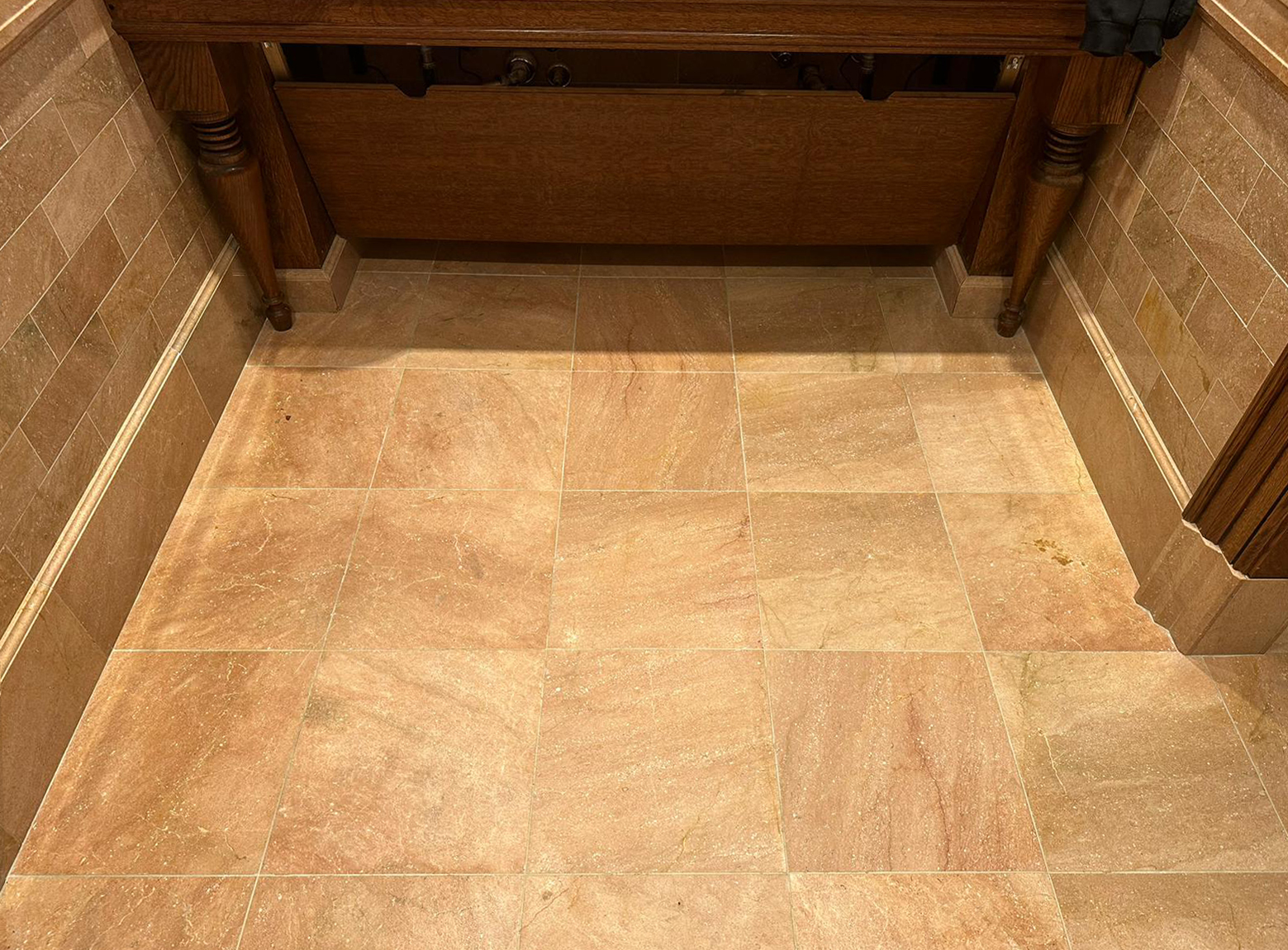 The master bathroom, adorned with elegant golden-brown marble, had lost its original brilliance. The flooring showed extensive acid etching and scratches, while the grout was visibly discolored and stained. The marble’s once high-gloss finish had deteriorated, leaving it dull and lackluster....